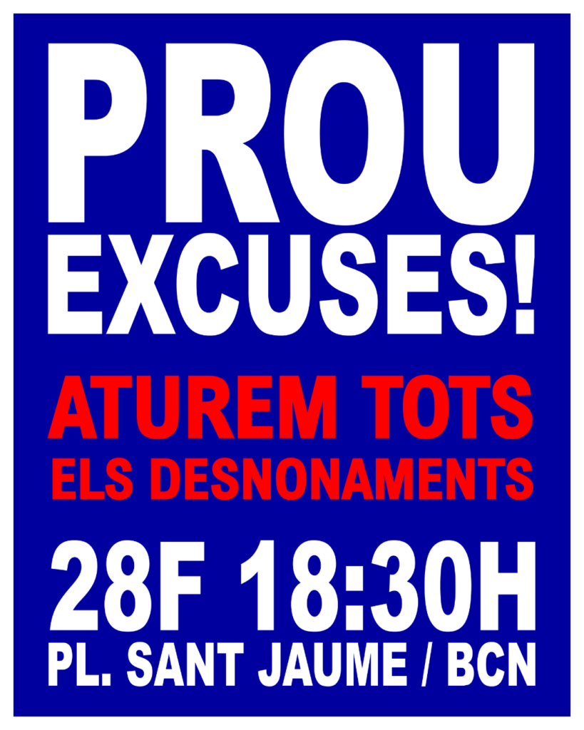 La PAH, el Sindicat de Llogateres, la Confederació Sindical d’Habitatge de Catalunya i el Sindicat d’Habitatge Socialista de Catalunya, organitzacions que conformem la Taula Sindicat d’Habitatge de Catalunya, convoquem una mobilització el proper dissabte 28 de febrer a les 18.30 h a la plaça Sant Jaume de Barcelona sota el lema “Prou excuses: els pisos, per viure-hi!”. A la crida, s’hi suma també la Marea Pensionista de Catalunya. La convocatòria tindrà lloc pocs dies abans de la votació al Congrés de la nova moratòria de desnonaments inclosa dins l’anomenat “escut social” i de la votació de la revalorització de les pensions. A més també es preveu que les properes setmanes es debati i voti al Congrés la llei del Sindicat per acabar amb les trampes del lloguer temporal i d’habitacions.