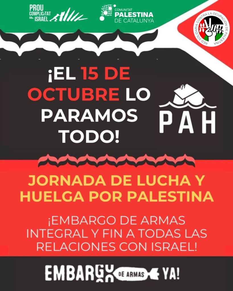 Desde La PAH nos sumamos a la huelga general del 15 de octubre por Palestina, convocada por numerosos colectivos sociales, sindicales y de derechos humanos en todo el Estado. Lo hacemos porque la defensa del derecho a la vivienda, a la vida y a la dignidad son inseparables.